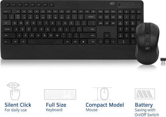 - De ACT AC5725 set bestaat uit een draadloos toetsenbord en muis die geschikt zijn voor dagelijks gebruik thuis of op kantoor. De set is gemaakt van gerecyclede materialen. Het toetsenbord is uitgerust met soft keys. De muis heeft een stille klik en een 1600 DPI sensor voor een optimale nauwkeurigheid en precisie. De set werkt via een enkele draadloze USB-A dongle en heeft een aan/uit-schakelaar voor langer batterijgebruik. De soft keys en stille klik zorgen voor een stille werking en zijn ideaal voor gebruik in kantoren, bibliotheken en gedeelde werkruimten.