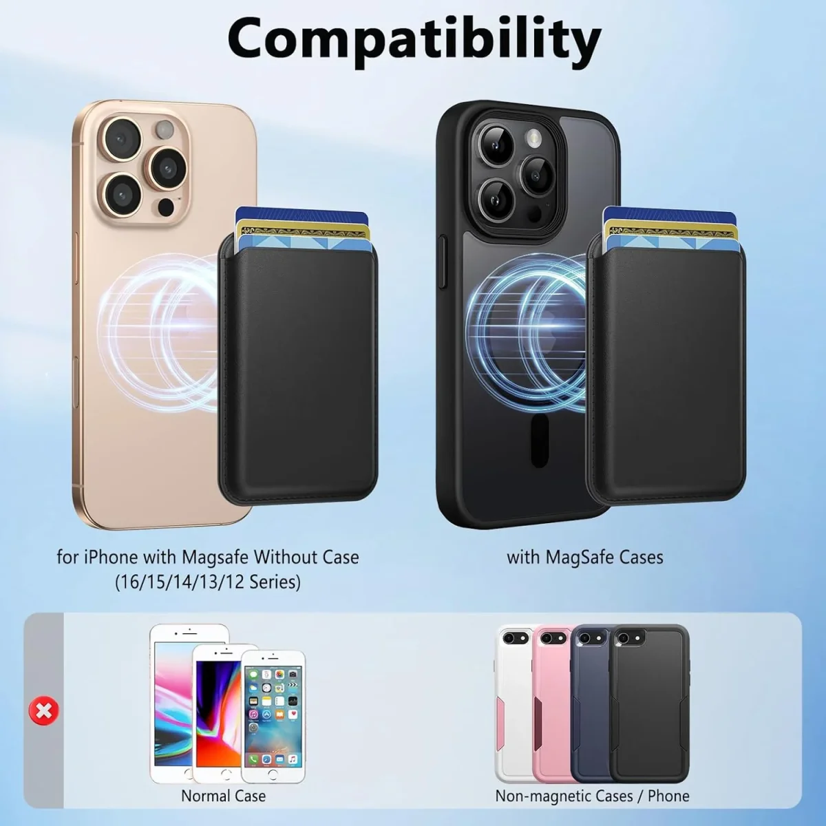 Let op: deze kaarthouder is ontworpen voor iPhones met MagSafe. Bij veel Samsung-modellen zit de camera lager, waardoor de magneet niet goed uitlijnt. Alleen met een hoesje dat de camera gelijk maakt met de achterkant kan het mogelijk werken – gebruik op Samsung is daarom niet standaard aanbevolen.