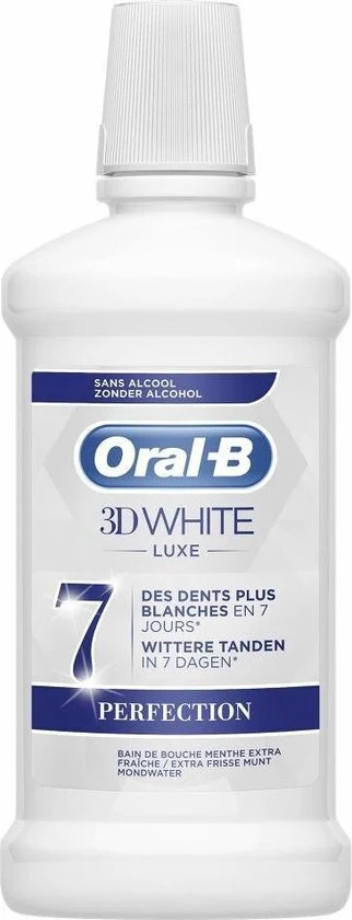 Oral-B 3D White Luxe Perfection Mondwater zorgt binnen 7 dagen voor wittere tanden door verkleuring aan de oppervlakte te verwijderen en zorgt ervoor dat je mond fris aanvoelt zonder het brandende gevoel van alcohol.