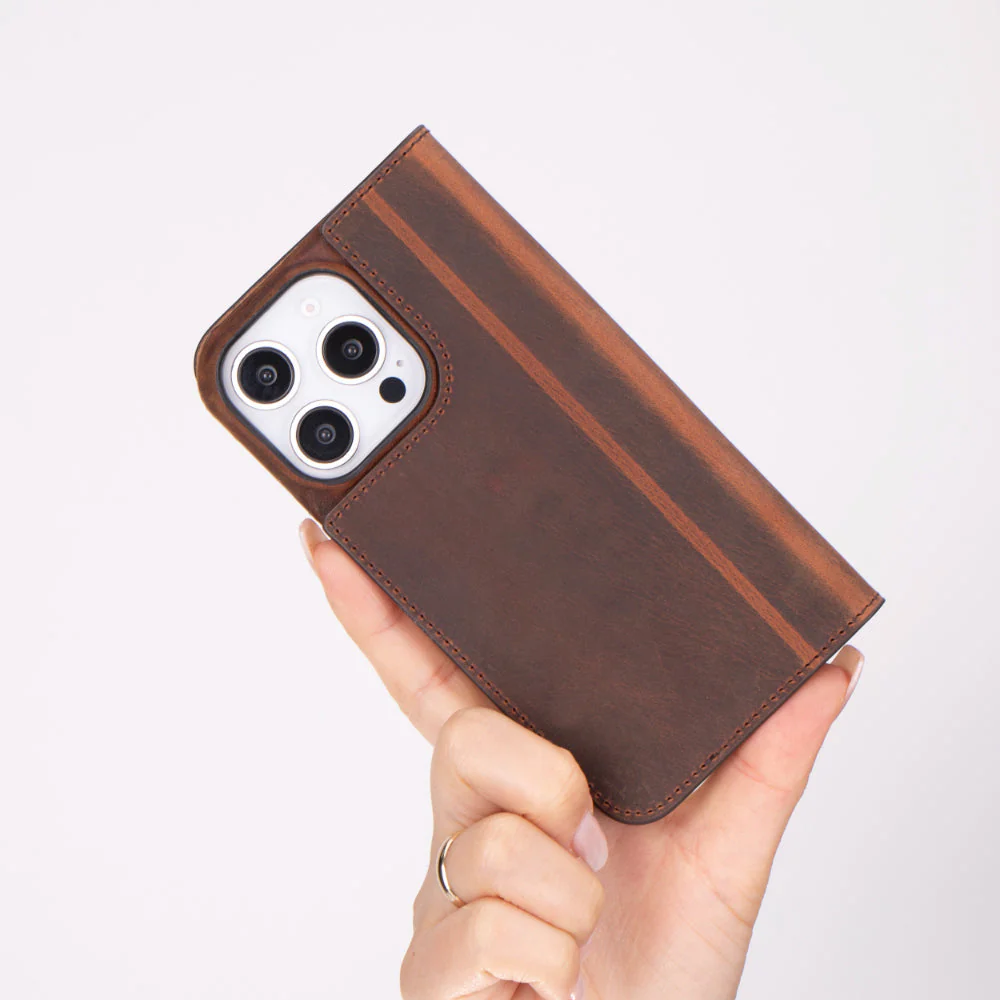 Leren foliohoesje voor de iPhone 16 Pro Max, speciaal gemaakt voor liefhebbers van leer. Het hoesje is vervaardigd uit echt leer en zal naarmate de tijd verstrijkt een tijdloze en robuuste uitstraling ontwikkelen, terwijl uw telefoon beschermd wordt tegen dagelijks gebruik.